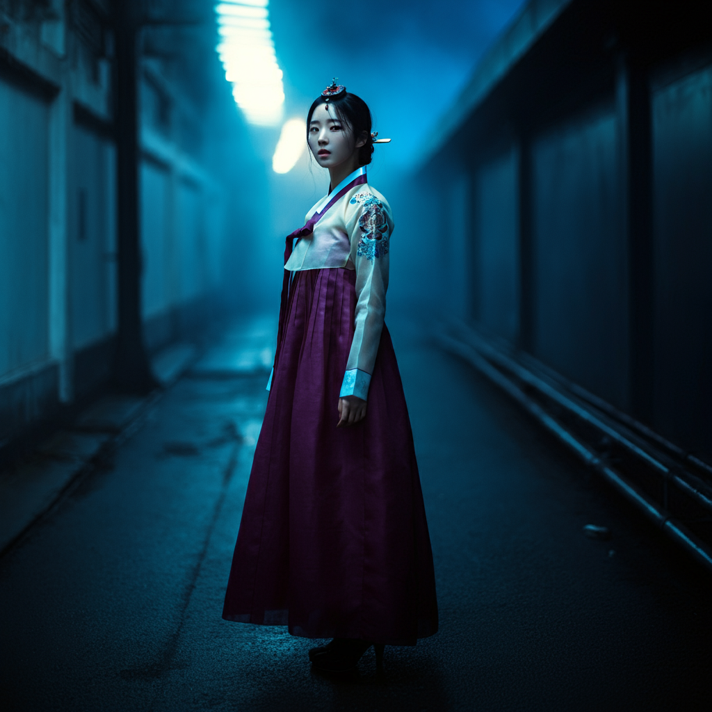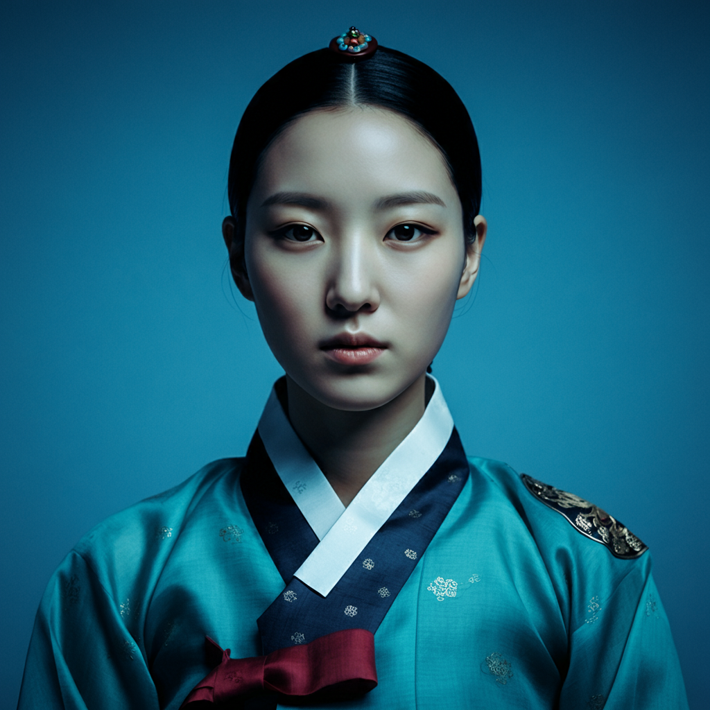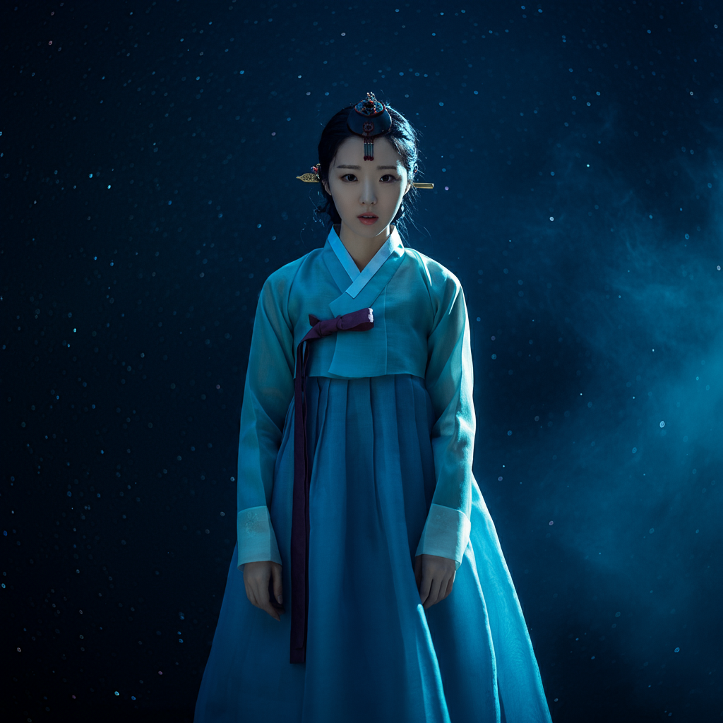 예시: "조선 시대 축제에서 전통 한복을 우아하게 입은 여성, 부드러운 자연광, 전신 이미지"