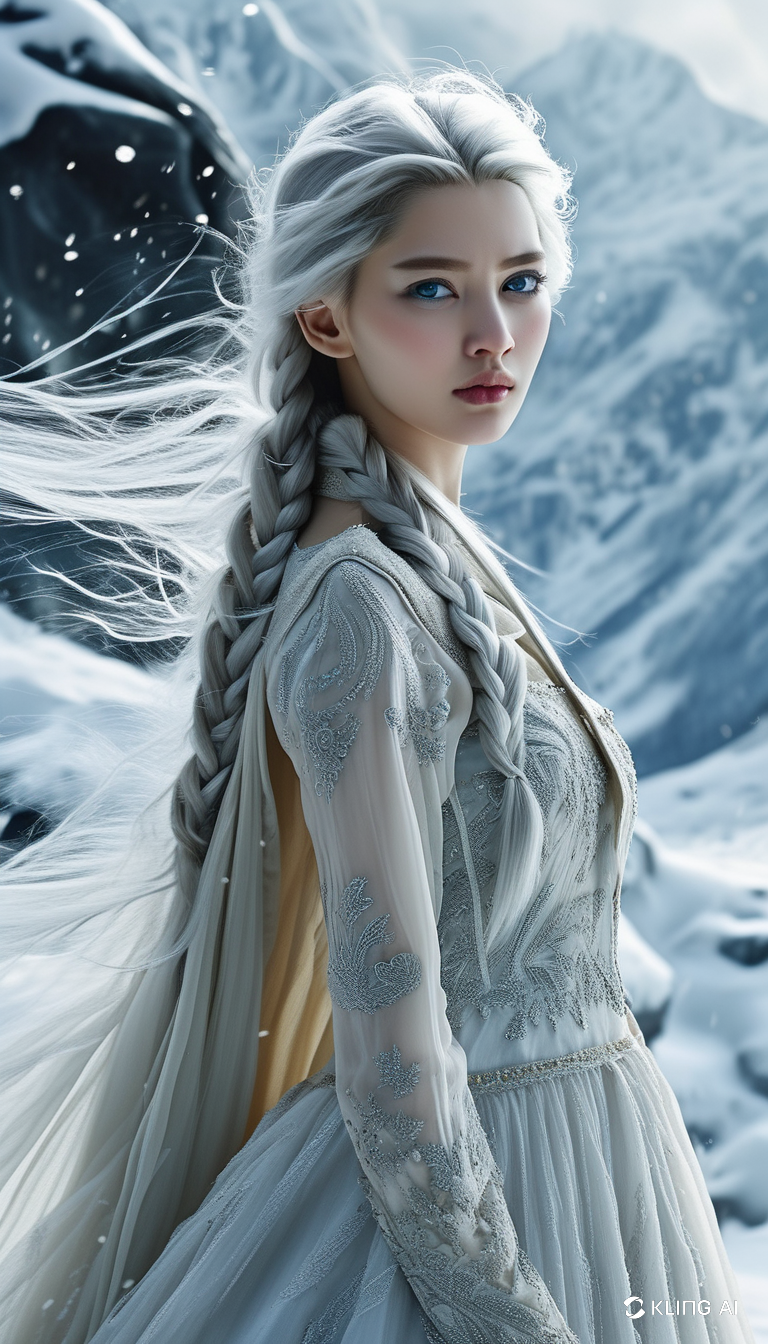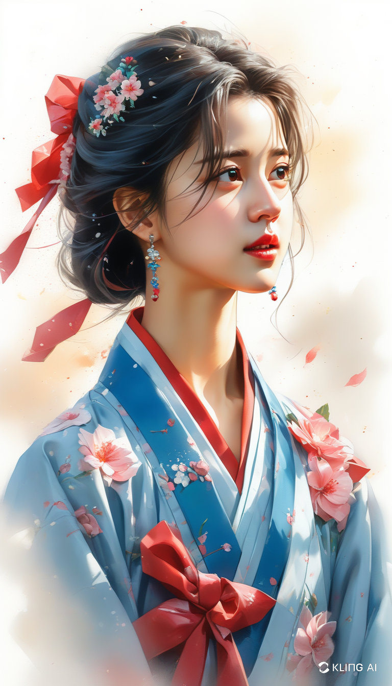 Keywords: soft woman, flowing fabric, pastel tones, gentle mood, elegance, Kling fashion, cinematic portrait