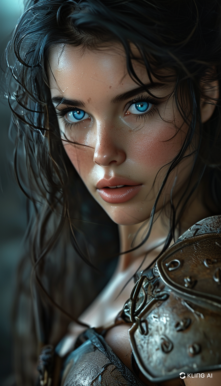 “A confident, powerful woman standing tall in a futuristic urban setting, wearing a structured high-fashion Kling-style outfit with metallic textures and bold colors, dramatic lighting, sharp shadows, cinematic atmosphere, strong gaze, powerful posture, editorial-style photography.”